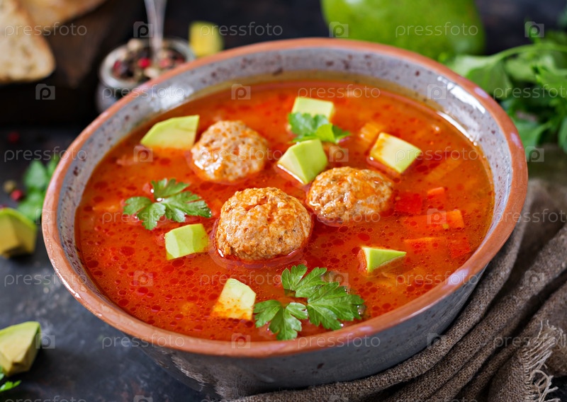 Пикантный томатный суп с фрикадельками и овощами. подается с авокадо и петрушкой. здоровый ужин