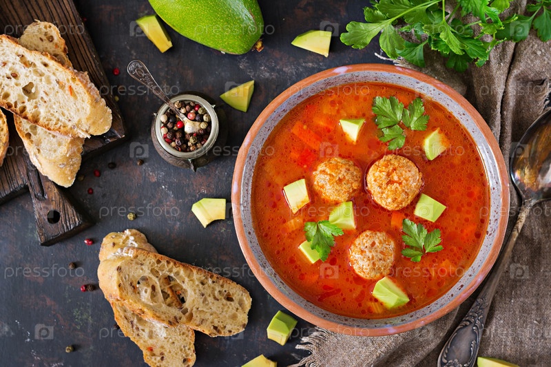 Пикантный томатный суп с фрикадельками и овощами. подается с авокадо и петрушкой. здоровый ужин. плоский лежит. вид сверху