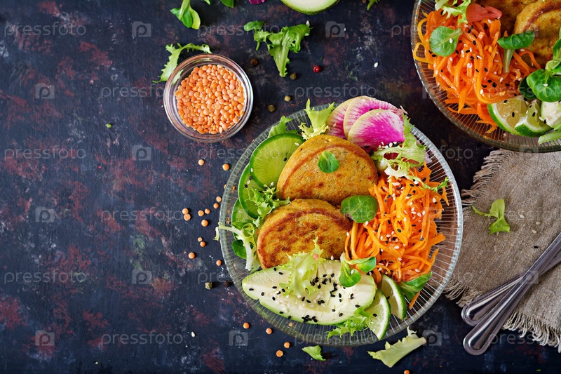 Веганская чаша Будды обеденный стол. Здоровая еда. Здоровая вегетарианская ланч-купа. Фриттер с чечевицей и редисом, авокадо, салат из моркови. Плоский слой. Вид сверху
