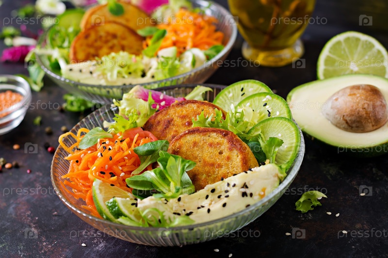 Веганская чаша Будды обеденный стол. Здоровая еда. Здоровая вегетарианская ланч-купа. Фритер с чечевицей и редисом, авокадо, салат из моркови