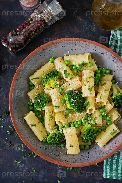Паста ригатони с брокколи и зеленым горохом. Веганское меню. Диетическая еда. Плоская кладка. Вид сверху