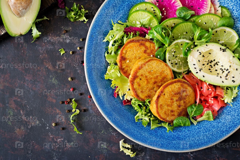 Веганская чаша Будды обеденный стол. Здоровая еда. Здоровая вегетарианская ланч-купа. Фритер с чечевицей и редисом, салат авокадо. Плоский слой. Вид сверху