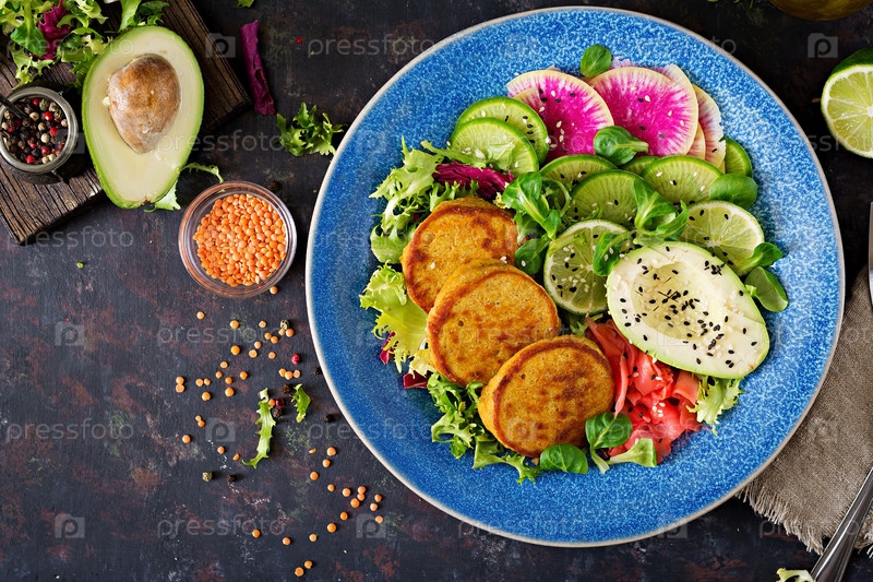 Веганская чаша Будды обеденный стол. Здоровая еда. Здоровая вегетарианская ланч-купа. Фритер с чечевицей и редисом, салат авокадо. Плоский слой. Вид сверху