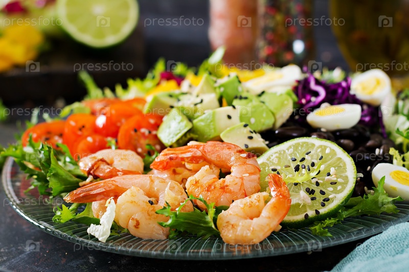 Здоровая салатная тарелка. Свежий рецепт морепродуктов. Жареные креветки и свежий овощный салат - авокадо, помидор, черные бобы, красную капусту и паприку. Жареный креветок. Здоровая еда