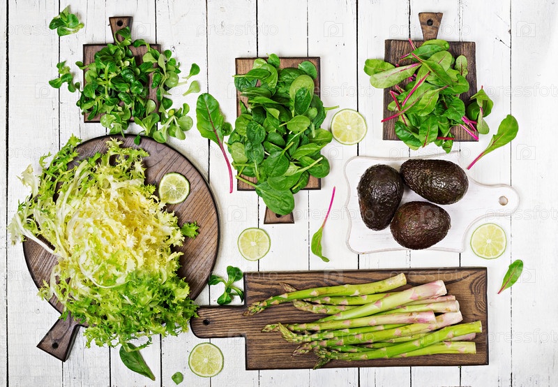 Зеленые травы, спаржа и черное авокадо на белом деревянном фоне. вид сверху. плоский слой