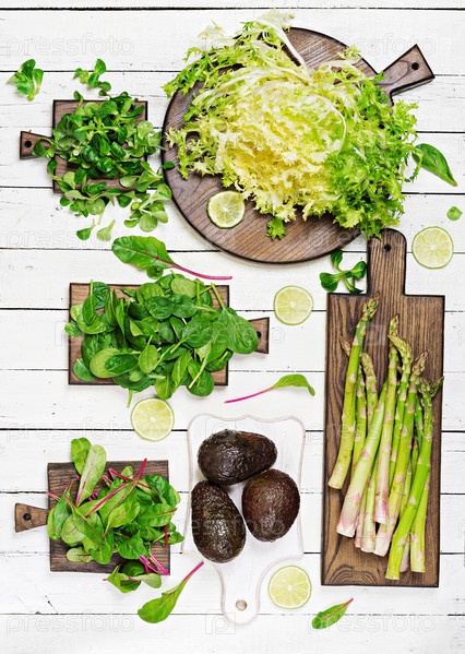 Зеленые травы, спаржа и черное авокадо на белом деревянном фоне. вид сверху. плоский слой