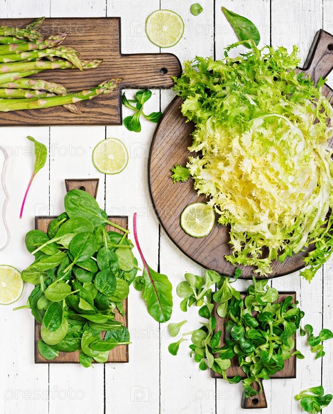 Зеленые травы, спаржа и черное авокадо на белом деревянном фоне. вид сверху. плоский слой