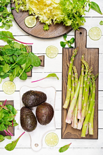 Зеленые травы, спаржа и черное авокадо на белом деревянном фоне. вид сверху. плоский слой