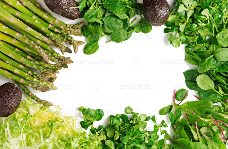 Зеленые травы, спаржа и черное авокадо на белом фоне. вид сверху. плоский слой