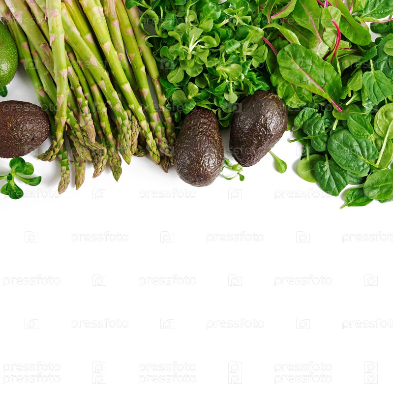 Зеленые травы, спаржа и черное авокадо на белом фоне. вид сверху. плоский слой