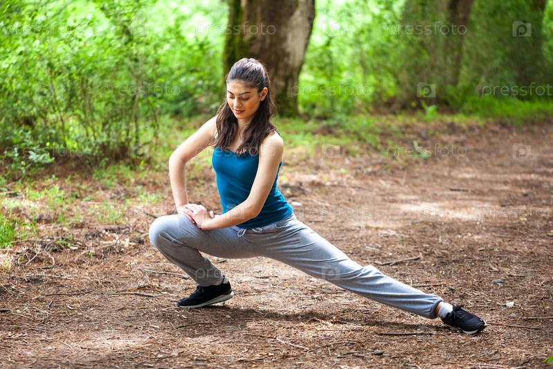 Прекрасная спортивная девушка в парке занимается фитнесом