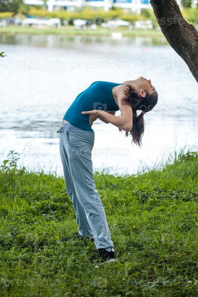 Прекрасная спортивная девушка в парке занимается фитнесом