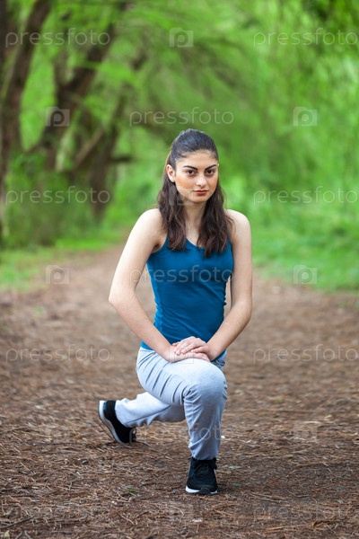 Прекрасная спортивная девушка в парке занимается фитнесом