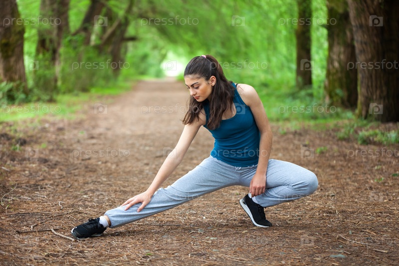 Прекрасная спортивная девушка в парке занимается фитнесом