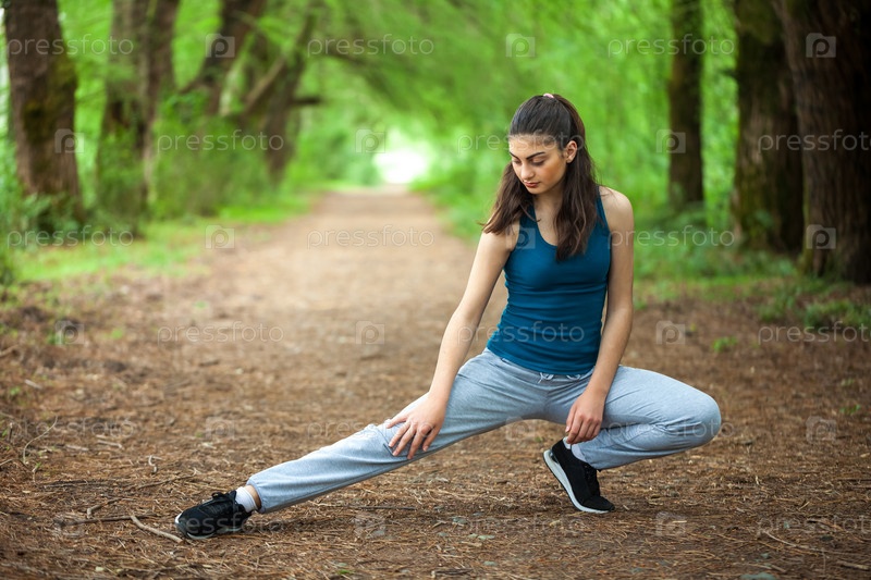 Прекрасная спортивная девушка в парке занимается фитнесом