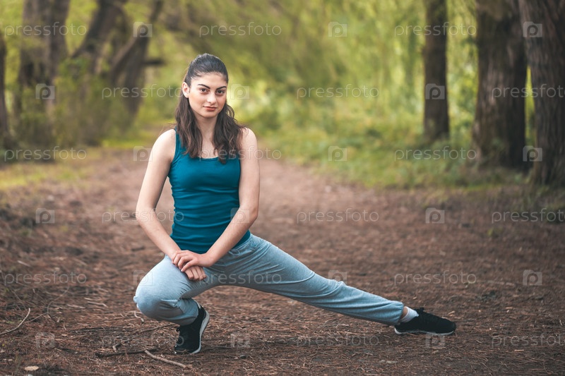 Прекрасная спортивная девушка в парке занимается фитнесом