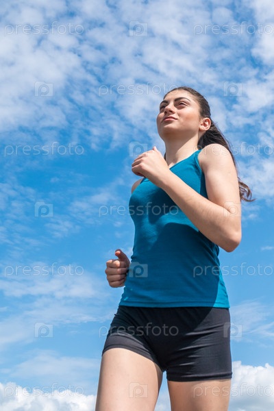 Молодая спортивная девушка бежит на фоне голубого неба