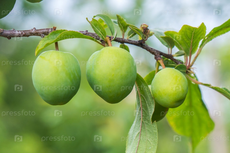 Молодые зеленые плоды сливы на дереве