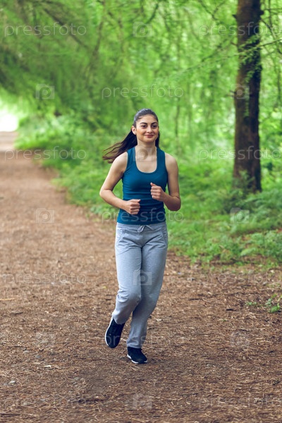 Красивая молодая девушка бегает в зеленом парке