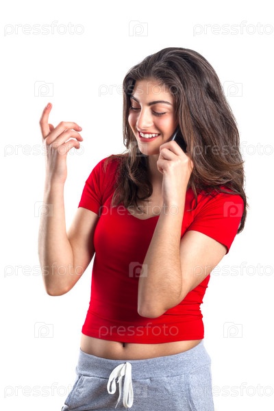 Веселая привлекательная молодая спортсменка с телефоном на белом фоне