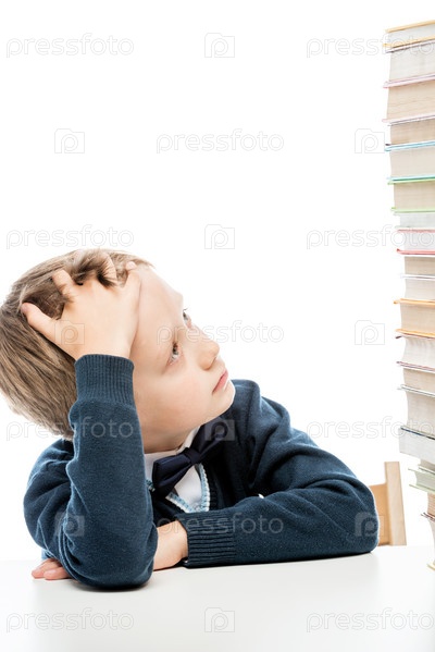 Портрет уставшего мальчика со стопкой книг на столе