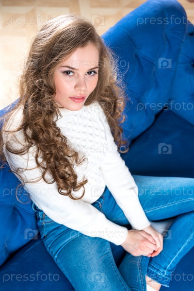 Красивая молодая девушка в теплом свитере и джинсах на диване