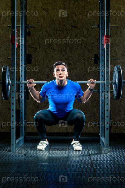 Спортсмен культурист готовится поднять тяжелую штангу в тренажерном зале