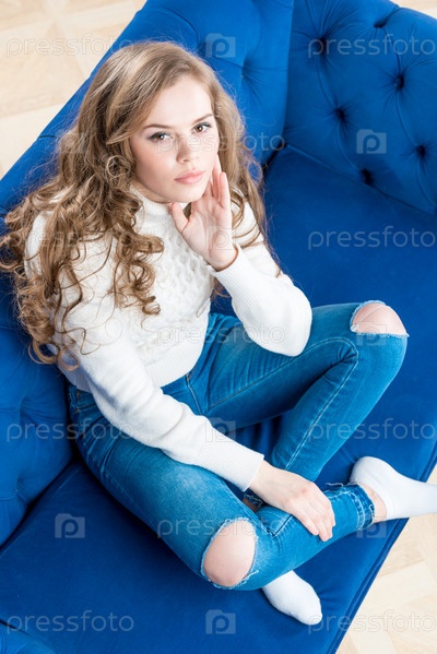 Милая девушка в теплом свитере на диване в гостиной