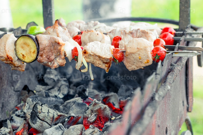 Аппетитный вкусный шашлык на шампурах на гриле над углями