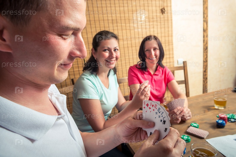 Мужчина и две женщины, играя в покер, человек, показывая свои карты