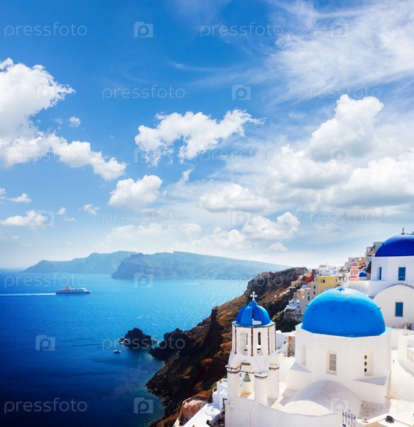 Вулкан кальдера с голубыми куполами церкви в солнечный день Ия, Санторини