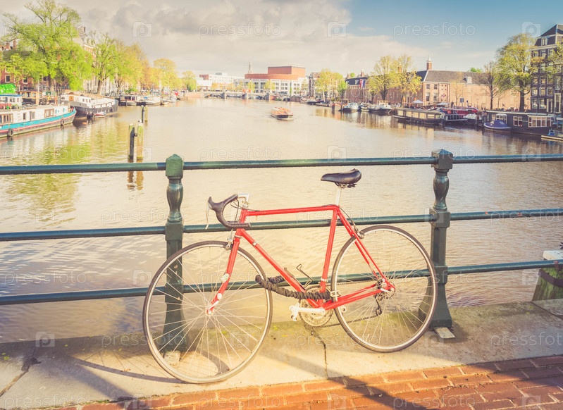 Старый велосипед рядом с каналом Амстердама