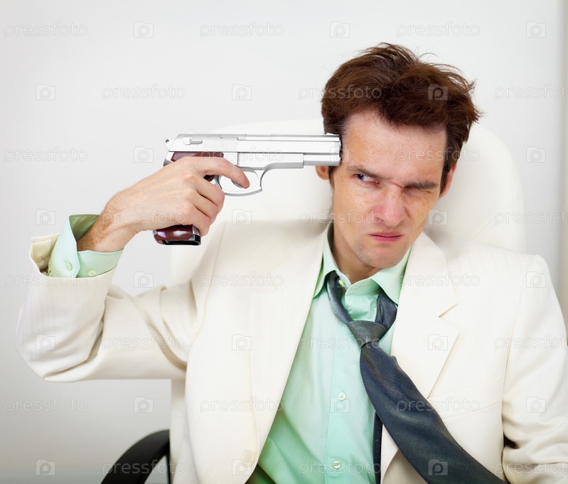 Всклокоченный бизнесмен в белом костюме с пистолетом