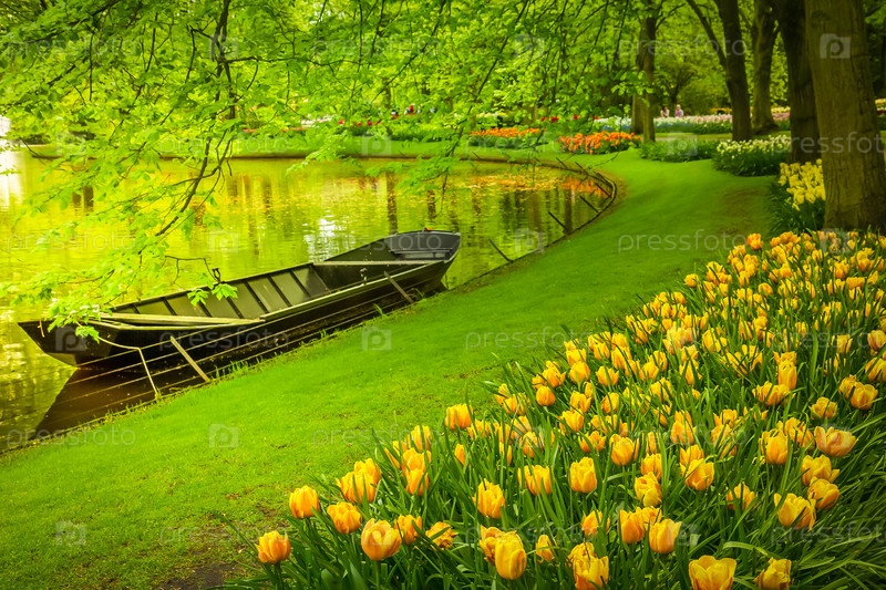 Весенний сад с каналом и лодками