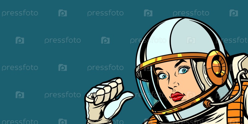 Астронавтская женщина кулаком рукой указывает на себя