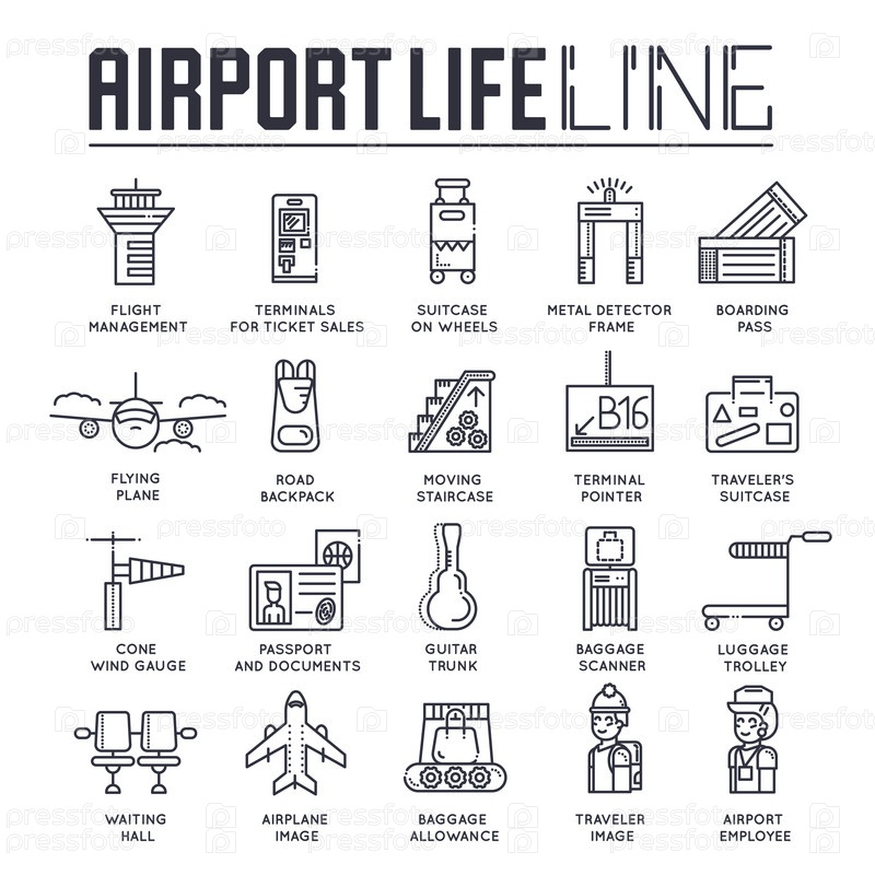 Персонал тонкой линии работает и регистрирует людей и багаж в дизайне аэропорта. Концепция векторной иллюстрации очертания регистрации