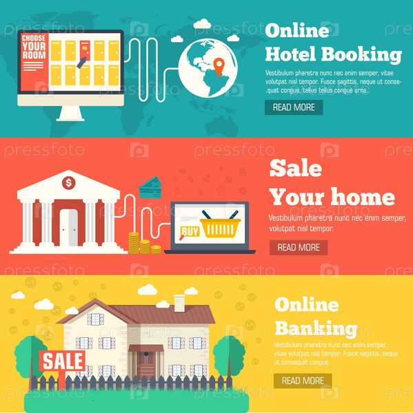 Плоский набор социальных бизнес-путешествий, онлайн-банкинга, парковки и дизайна баннеров для продажи домов