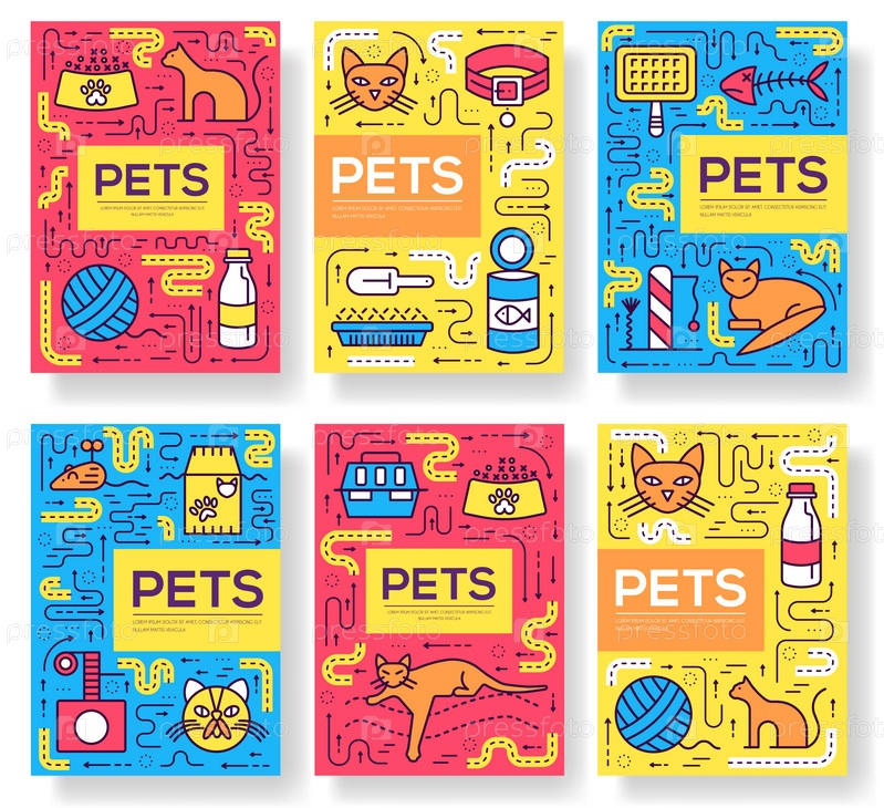 Породные кошки векторная брошюра карт тонкий линейный набор. Милый образец животных flyear, журналы, плакаты, обложки книг, баннеры. Layout different kitten outline illustrations modern pages