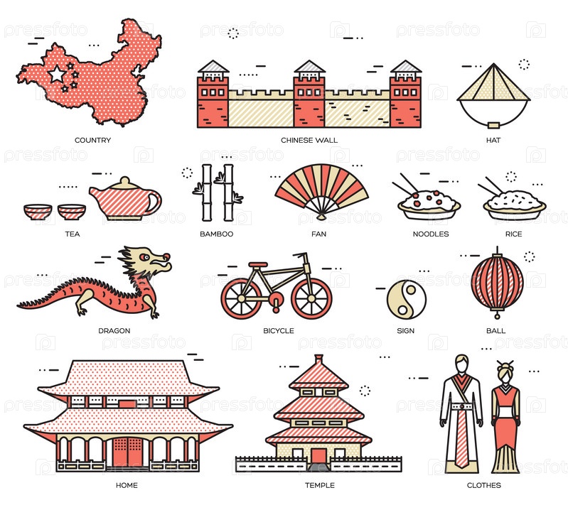 Страна Китай путешествие отпускное руководство по товарам, местам в тонких линиях стильный дизайн. Набор архитектуры, моды, людей, концепции фона природы. Инфографический шаблон для веб и мобильных устройств на векторной плоскости
