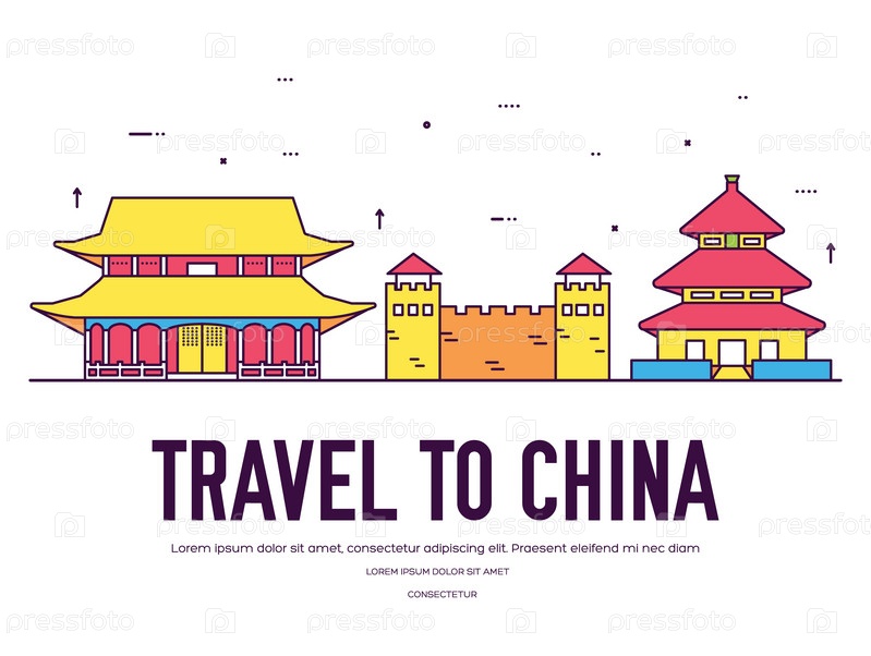 Страна Китай путешествия отдых места и особенности. Набор архитектуры, предмета, концепции фона природы. Инфографика традиционной этнической плоскости, контур, тонкая линия икона