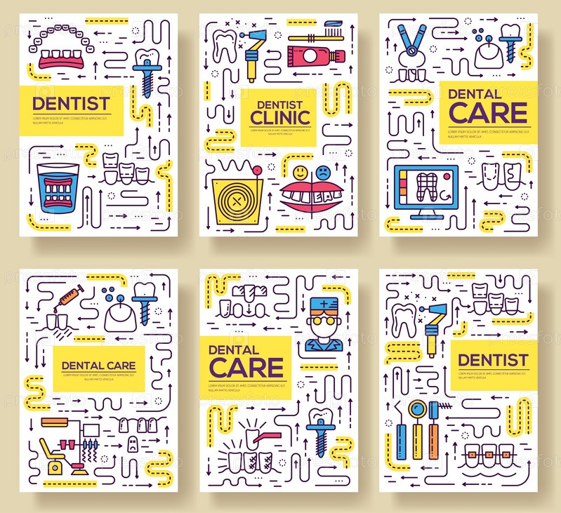Тонкая линия стоматологическая клиника пекарня брошюра карт набор. Детские инструменты шаблон flyear, журналы, плакаты, обложки книг, баннеры. Описание медицинского приглашения концепция
