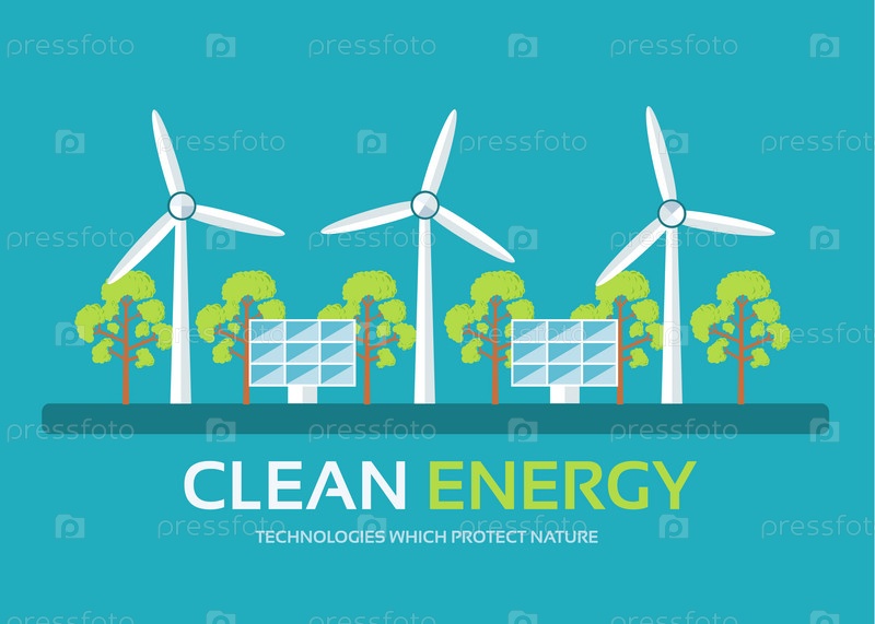 Технология экологии в плоском дизайне концепция фона. Эко-чистая энергия вокруг зеленого дерева для защиты природы. Иконки для вашего продукта или иллюстрации, веб и мобильные приложения