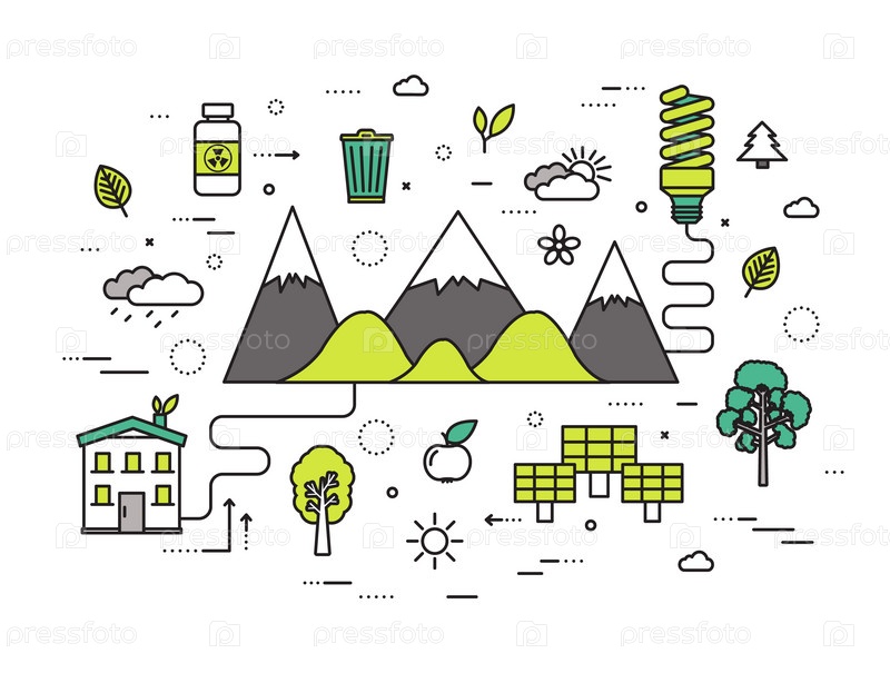 Тонкая линия природные ресурсы современная концепция иллюстрации. Инфографический путь от экологии к чистой энергии. Иконки на изолированном белом фоне. Плоский векторный шаблон дизайна для веб- и мобильных приложений