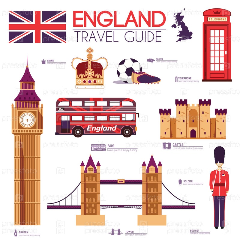 Страна Англия путешествие отпускное руководство по товарам, местам и особенностям. Набор архитектуры, людей, спорта, предметов, значков концепции фона. Инфографические шаблоны дизайна для веб-и мобильных устройств. На плоском стиле