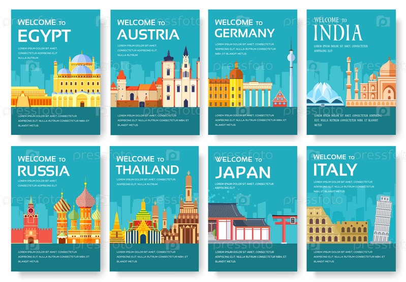 Страна Египет, Австрия, Германия, Индия, Россия, Таиланд, Япония, Италия карточный набор. Путешествие по миру флаеров, журналов, плакатов, обложки книг, баннеров. Лейдинг инфографический шаблон иллюстрации страницы