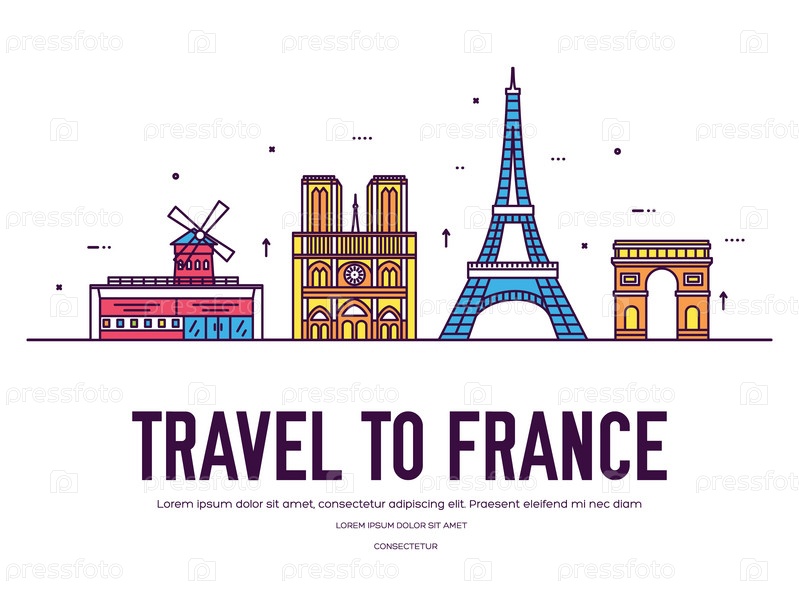 Страна Франция путешествия отдых места и особенности. Набор архитектуры, предмета, концепции фона природы. Инфографическая традиционная этническая квартира, контур, тонкая линия икона