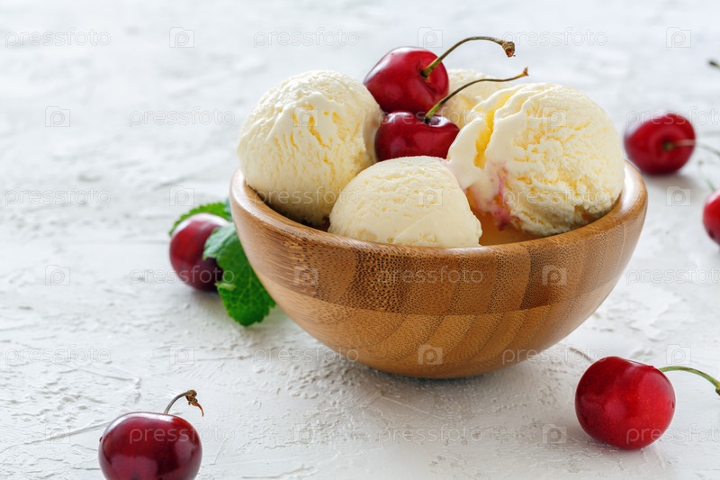 Сунда с сладкой вишней в деревянной миске