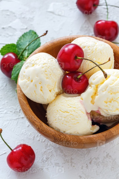 Ванильное мороженое со сладкой вишней в деревянной миске
