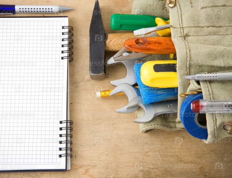 Инструменты и блокнот на дереве
