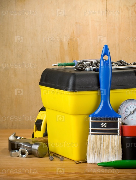 Инструменты и коробка инструментов на дереве
